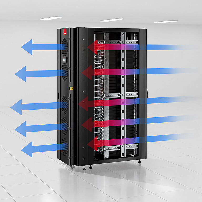The rear door of the server rack is replaced by the CyberRack Active Rear Door. With the aid of the integrated heat exchanger, the unit cools your servers right there where the heat is produced, without discharging return air into the room. The IT room therefore has no additional heat at all.